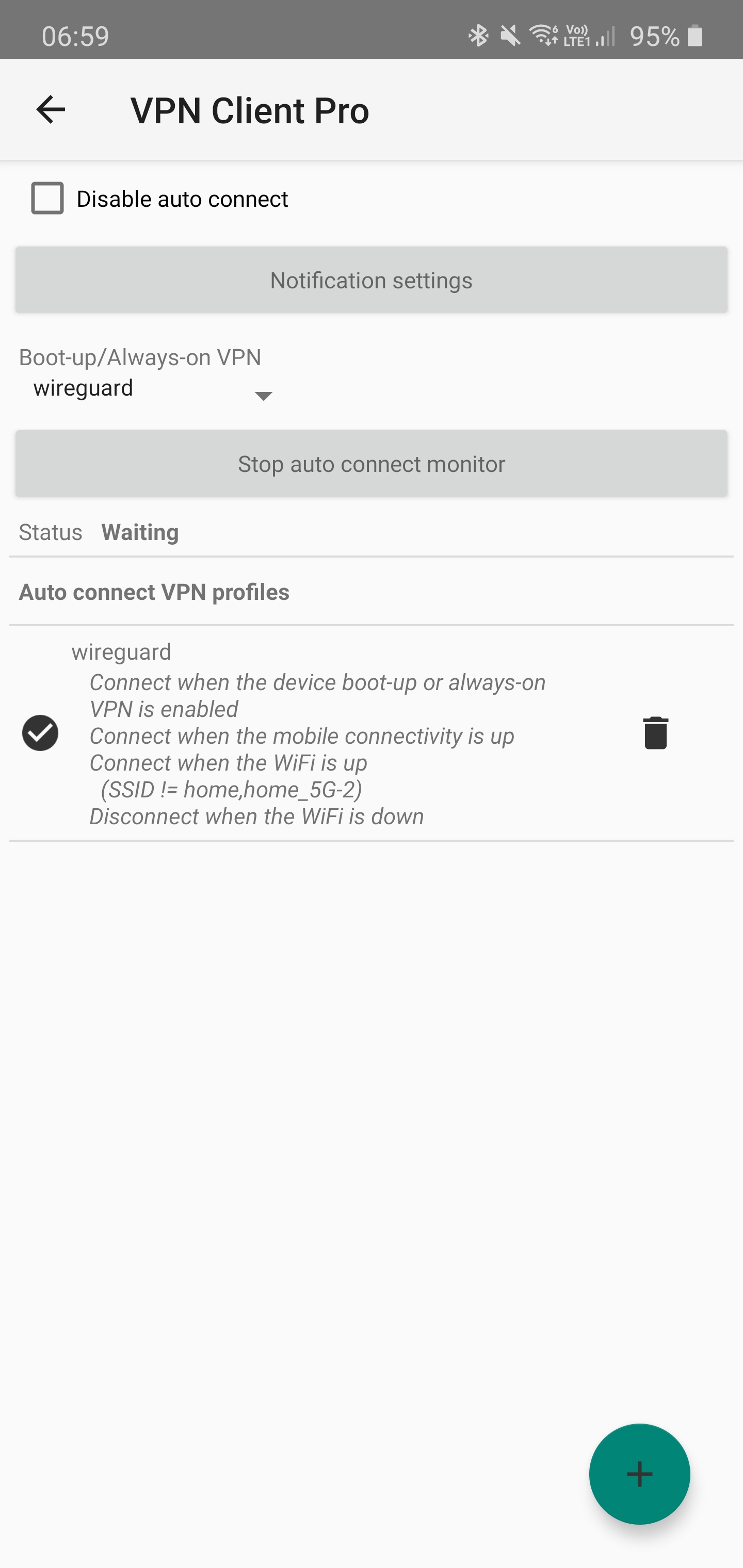 First of all, thank you for the great app. The only issue I have is, that the wireguard VPN does not disconnect automatically when connected to the home wifi, even if the SSID is selected in the auto connect exception list (see screenshot). The app doesn't seem to recognize the SSID the phone (Samsung Note10+, Android 10 original) connects to. Is there a known fix to this I have to change on the router or the phone? (Btw. even selecting "Disconnect when the mobile connectivity is down" doesn't fix the issue).